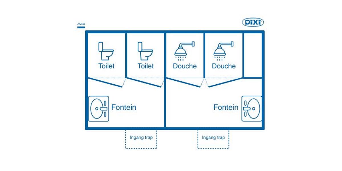 Een gecombineerde douchewagen die twee doucheruimtes en twee toiletruimtes bevat. De wagen is uitgerust met elektrische verwarming en beschikt over mechanische ventilatie. Warm water wordt verkregen door badgeisers op propaangas.