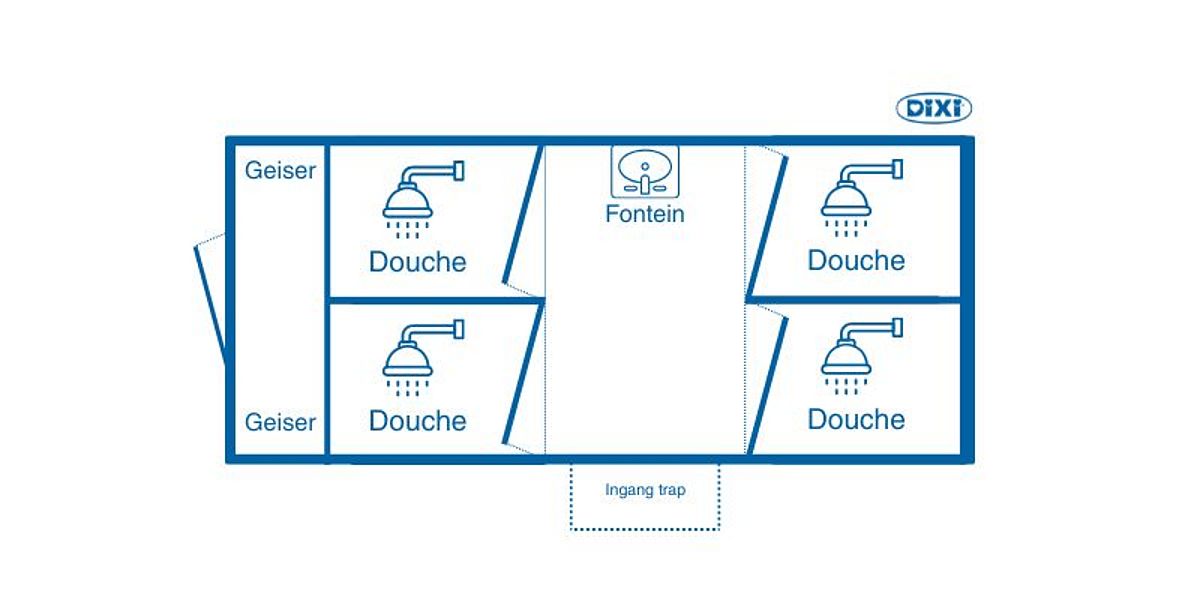 Deze douchewagen met vier doucheruimtes beschikt over elektrische verwarming en wordt door een mechanische ventilatie geventileerd. Warm water wordt verkregen door badgeisers op propaangas.
