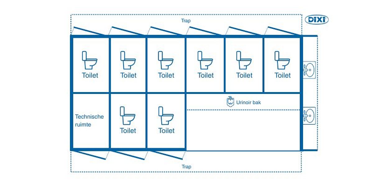 Deze toiletwagen heeft zes damestoiletten, twee herentoiletten, een urinegoot en een handwasgoot die plaats biedt aan vier personen. Daarnaast beschikt de wagen over spiegels, zeepautomaten en elektrische handrogers.
